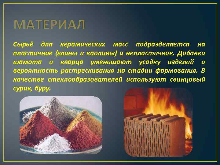 МАТЕРИАЛ Сырьё для керамических масс подразделяется на пластичное (глины и каолины) и непластичное. Добавки шамота и кварца уменьшают усадку изделий и вероятность растрескивания на стадии формования. В качестве стеклообразователей используют свинцовый сурик, буру.