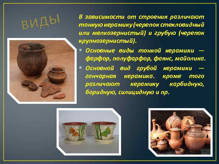 ИДЫ В В зависимости от строения различают тонкую керамику (черепок стекловидный или мелкозернистый) и грубую (черепок крупнозернистый). § Основные виды тонкой керамики — фарфор, полуфарфор, фаянс, майолика. § Основной вид грубой керамики — гончарная керамика. кроме того различают керамику карбидную, боридную, силицидную и пр.