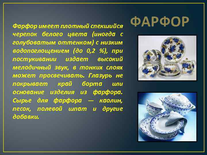 Фарфор имеет плотный спекшийся черепок белого цвета (иногда с голубоватым оттенком) с низким водопоглощением (до 0, 2 %), при постукивании издает высокий мелодичный звук, в тонких слоях может просвечивать. Глазурь не покрывает край борта или основание изделия из фарфора. Сырье для фарфора — каолин, песок, полевой шпат и другие добавки. ФАРФОР