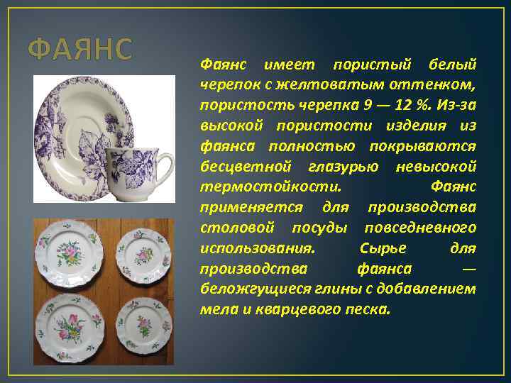 ФАЯНС Фаянс имеет пористый белый черепок с желтоватым оттенком, пористость черепка 9 — 12 %. Из-за высокой пористости изделия из фаянса полностью покрываются бесцветной глазурью невысокой термостойкости. Фаянс применяется для производства столовой посуды повседневного использования. Сырье для производства фаянса — беложгущиеся глины с добавлением мела и кварцевого песка.