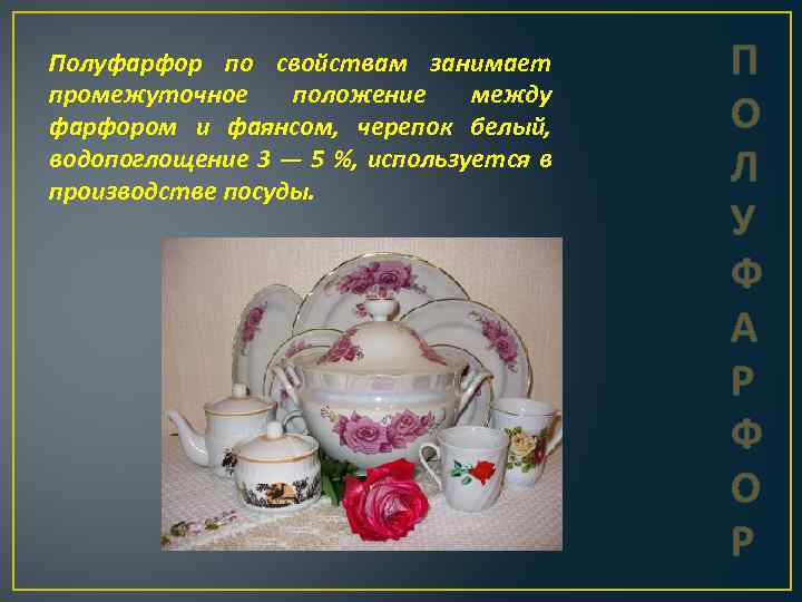 Полуфарфор по свойствам занимает промежуточное положение между фарфором и фаянсом, черепок белый, водопоглощение 3 — 5 %, используется в производстве посуды. П О Л У Ф А Р Ф О Р