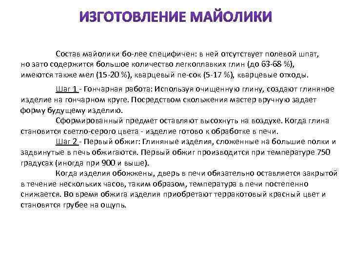 Состав майолики бо лее специфичен: в ней отсутствует полевой шпат, но зато содержится большое количество легкоплавких глин (до 63 68 %), имеются также мел (15 20 %), кварцевый пе сок (5 17 %), кварцевые отходы. Шаг 1 Гончарная работа: Используя очищенную глину, создают глиняное изделие на гончарном круге. Посредством скольжения мастер вручную задает форму будущему изделию. Сформированный предмет оставляют высохнуть на воздухе. Когда глина становится светло серого цвета изделие готово к обработке в печи. Шаг 2 Первый обжиг: Глиняные изделия, сложенные на большие полки и задвинутые в печь обжигаются. Первый обжиг производится при температуре 750 градусах (иногда при 900 и выше). Когда изделия обожжены, дверь в печи обязательно оставляется закрытой в течение нескольких часов, таким образом, температура в печи постепенно снижается. Во время обжига изделия приобретают терракотовый красный цвет и становятся грубее на ощупь.