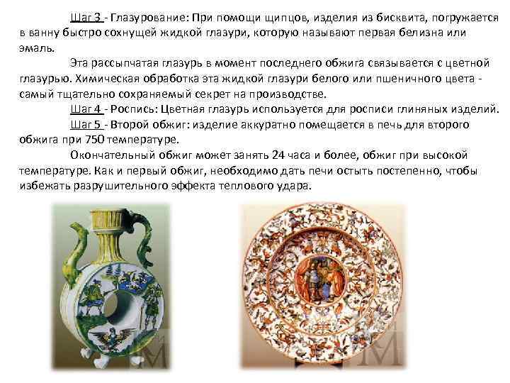 Шаг 3 Глазурование: При помощи щипцов, изделия из бисквита, погружается в ванну быстро сохнущей жидкой глазури, которую называют первая белизна или эмаль. Эта рассыпчатая глазурь в момент последнего обжига связывается с цветной глазурью. Химическая обработка эта жидкой глазури белого или пшеничного цвета самый тщательно сохраняемый секрет на производстве. Шаг 4 Роспись: Цветная глазурь используется для росписи глиняных изделий. Шаг 5 Второй обжиг: изделие аккуратно помещается в печь для второго обжига при 750 температуре. Окончательный обжиг может занять 24 часа и более, обжиг при высокой температуре. Как и первый обжиг, необходимо дать печи остыть постепенно, чтобы избежать разрушительного эффекта теплового удара.