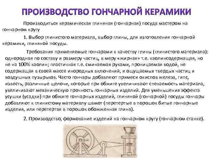 Производиться керамическая глиняная (гончарная) посуда мастером на гончарном кругу 1. Выбор глинистого материала, выбор глины, для изготовления гончарной керамики, глиняной посуды. Требования применяемые гончарами к качеству глины (глинистого материала): однородная по составу и размеру частиц, в меру «жирная» т. е. каолинсодержащая, но не на 100% каолин; пластичная т. е. сминаемая руками, проницаемая водой, не содержащая в своей массе инородных включений, и ощущаемых твердых частиц и воздушных пузырьков. Часто гончары добавляют примеси окислов железа, гипс, известь, различные щелочи, которые при обжиге увеличивают спекаемость материала, увеличивают механическую прочность гончарных изделий. Для уменьшения эффекта усушки (усадки) при обжиге гончарных изделий, глиняной (гончарной) посуды гончары добавляют к глинистому материалу шамот (перетертые в порошок битые гончарные изделия, или перетертая в порошок обожженная глина). 2. Производство, формование изделий на гончарном кругу (гончарном станке).
