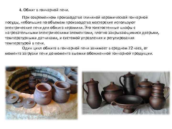 4. Обжиг в гончарной печи. При современном производстве глиняной керамической гончарной посуды, небольшие по объемам производства мастерские используют электрические печи для обжига керамики. Это толстостенные шкафы с нагревательными электрическими элементами, плотно закрывающимися дверьми, температурными датчиками, и системой управления и регулирования температурой в печи. Один цикл обжига в гончарной печи занимает в среднем 72 часа, от момента загрузки печи до момента выемки обожженной гончарной продукции.