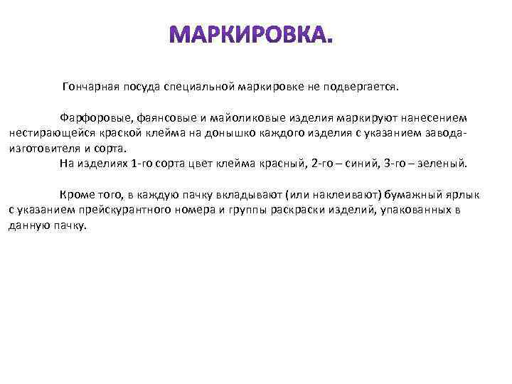 Гончарная посуда специальной маркировке не подвергается. Фарфоровые, фаянсовые и майоликовые изделия маркируют нанесением нестирающейся краской клейма на донышко каждого изделия с указанием завода изготовителя и сорта. На изделиях 1 го сорта цвет клейма красный, 2 го – синий, 3 го – зеленый. Кроме того, в каждую пачку вкладывают (или наклеивают) бумажный ярлык с указанием прейскурантного номера и группы раски изделий, упакованных в данную пачку.