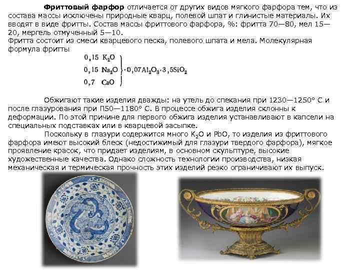 Фриттовый фарфор отличается от других видов мягкого фарфора тем, что из состава массы исключены природные кварц, полевой шпат и глинистые материалы. Их вводят в виде фритты. Состав массы фриттового фарфора, %: фритта 70— 80, мел 15— 20, мергель отмученный 5— 10. Фритта состоит из смеси кварцевого песка, полевого шпата и мела. Молекулярная формула фритты Обжигают такие изделия дважды: на утель до спекания при 1230— 1250° С и после глазурования при П 50— 1180° С. В процессе обжига изделия склонны к деформации. По этой причине для первого обжига изделия устанавливают в капсели на специальных подставках или в кварцевой засыпке. Поскольку в глазури содержится много K 2 O и Pb. O, то изделия из фриттового фарфора имеют высокий блеск (недостижимый для глазури твердого фарфора), мягкое проявление красок, что придает изделиям, в основном скульптуре, высокие художественные качества. Однако сложность технологии производства, низкая механическая и термическая прочность этих изделий резко ограничивают их выпуск.