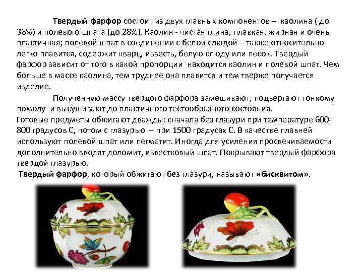 Твердый фарфор состоит из двух главных компонентов – каолина ( до 36%) и полевого шпата (до 28%). Каолин чистая глина, плавкая, жирная и очень пластичная; полевой шпат в соединении с белой слюдой – также относительно легко плавится, содержит кварц, известь, белую слюду или песок. Твердый фарфор зависит от того в какой пропорции находится каолин и полевой шпат. Чем больше в массе каолина, тем труднее она плавится и тем тверже получается изделие. Полученную массу твердого фарфора замешивают, подвергают тонкому помолу и высушивают до пластичного тестообразного состояния. Готовые предметы обжигают дважды: сначала без глазури при температуре 600 800 градусов С, потом с глазурью – при 1500 градусах С. В качестве плавней используют полевой шпат или пегматит. Иногда для усиления просвечиваемости дополнительно вводят доломит, известковый шпат. Покрывают твердый фарфора твердой глазурью. Твердый фарфор, который обжигают без глазури, называют «бисквитом» .
