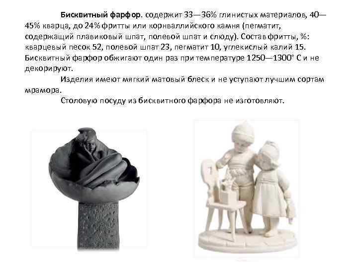 Бисквитный фарфор. содержит 33— 36% глинистых материалов, 40— 45% кварца, до 24% фритты или корнваллийского камня (пегматит, содержащий плавиковый шпат, полевой шпат и слюду). Состав фритты, %: кварцевый песок 52, полевой шпат 23, пегматит 10, углекислый калий 15. Бисквитный фарфор обжигают один раз при температуре 1250— 1300° С и не декорируют. Изделия имеют мягкий матовый блеск и не уступают лучшим сортам мрамора. Столовую посуду из бисквитного фарфора не изготовляют.
