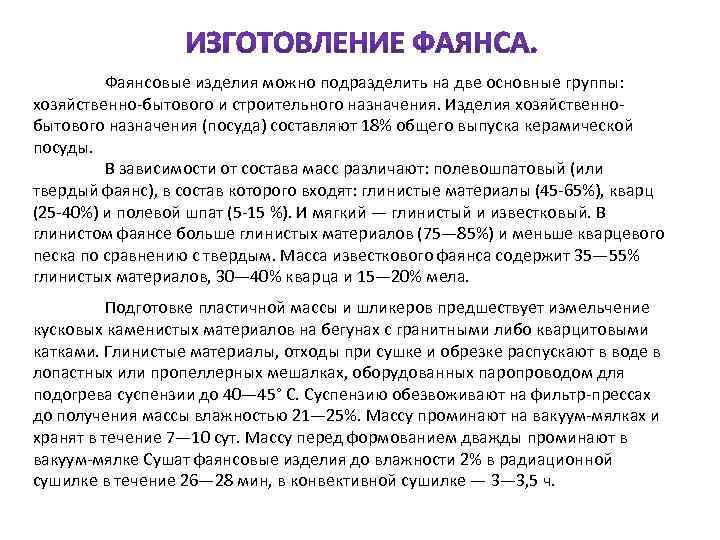 Фаянсовые изделия можно подразделить на две основные группы: хозяйственно бытового и строительного назначения. Изделия хозяйственно бытового назначения (посуда) составляют 18% общего выпуска керамической посуды. В зависимости от состава масс различают: полевошпатовый (или твердый фаянс), в состав которого входят: глинистые материалы (45 65%), кварц (25 40%) и полевой шпат (5 15 %). И мягкий — глинистый и известковый. В глинистом фаянсе больше глинистых материалов (75— 85%) и меньше кварцевого песка по сравнению с твердым. Масса известкового фаянса содержит 35— 55% глинистых материалов, 30— 40% кварца и 15— 20% мела. Подготовке пластичной массы и шликеров предшествует измельчение кусковых каменистых материалов на бегунах с гранитными либо кварцитовыми катками. Глинистые материалы, отходы при сушке и обрезке распускают в воде в лопастных или пропеллерных мешалках, оборудованных паропроводом для подогрева суспензии до 40— 45° С. Суспензию обезвоживают на фильтр прессах до получения массы влажностью 21— 25%. Массу проминают на вакуум мялках и хранят в течение 7— 10 сут. Массу перед формованием дважды проминают в вакуум мялке Сушат фаянсовые изделия до влажности 2% в радиационной сушилке в течение 26— 28 мин, в конвективной сушилке — 3— 3, 5 ч.
