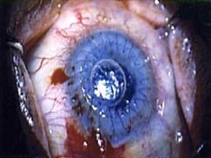 Две недели после кератопластики. Хорошо видны множественные стежки.