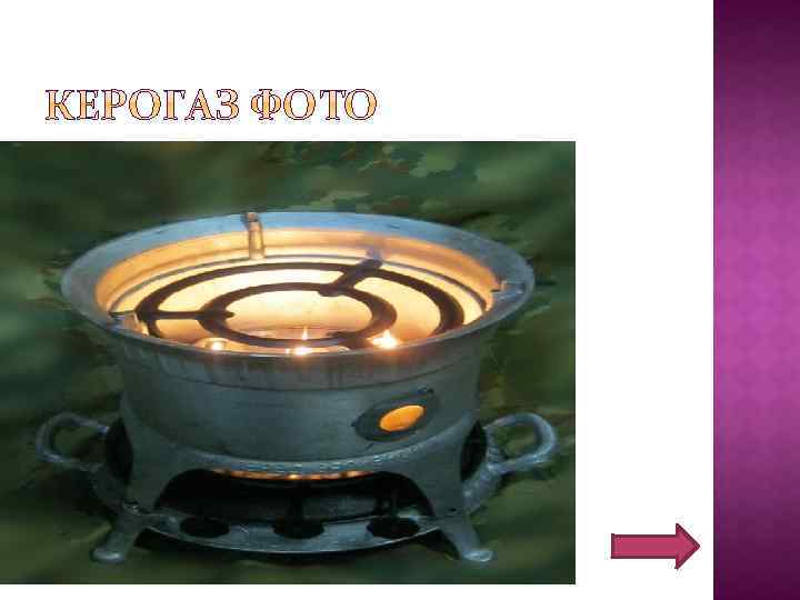 Керога з — нагревательный прибор, работающий на керосине. Предназначен для приготовления пищи, кипячения воды и др. Имеет фитиль, но в отличие от керосинки фитиль не соприкасается с пламенем, он необходим только для капиллярного подъёма и испарения топлива. На металлической раме, напоминающей табурет, смонтированы: кольцеобразный поддон, в который поступает керосин из резервуара, питательная трубка с горелкой и газосмесителем, на котором и происходит горение паров керосина. Резервуар керосина — съёмный, заправка происходит через отверстие, закрытое крышкой с игольчатым клапаном. После заправки резервуар переворачивается «вниз крышкой» , устанавливается на место, игольчатый клапан открывается и происходит автоматическое поддержание уровня топлива в кольцеобразном поддоне. Интенсивность горения (высота пламени) регулируется винтом, при регулировке происходит наклон кольцеобразного поддона, следовательно, изменяется уровень топлива в этом поддоне.
