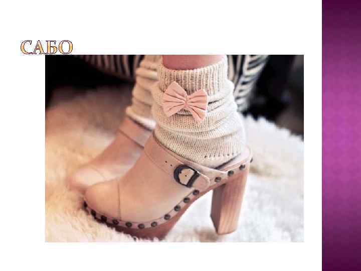 Сабо –это обычно мн. ч. босоножки на толстой деревянной платформе, также башмаки, выдолбленные из дерева ◆ Дружба с загорелыми и заскорузлыми рыбаками в жёлтых клеёнчатых куртках, зелёное море, чёрные силуэты бретонок в кружевных головных уборах, прибрежные камни и скалы, ночная игра маяков, цокот деревянных сабо. Анненков Юрий, «Дневник моих встреч» , 1966 г. (цитата из. Национального корпуса русского языка, см. Список литературы) ◆ Потолок и стены были увешаны разного вида сабо, по-овернски «галош» . Виктор Некрасов, «Маленькая печальная повесть» , 1986 г. ◆ Передвигался он в самодельных сабо на деревянном ходу — последний хипповый писк, и они предвещали его приход жутковатым стуком задолго до появления. А. В. Макаревич, «Все очень просто» , 1990 г. ◆ Сабо на устойчивом каблуке — чёрного, коричневого цветов и с рисунком под змеиную кожу — стоят $164 (прежняя цена — $259). Галина Потягаева, «Привоз // «Коммерсантъ. Daily» » , 1996. 01. 20 г. ◆ Я поняла, почему арабы предпочитали носить сабо, — чтобы было всегда легко их снимать и надевать. Артем Тарасов