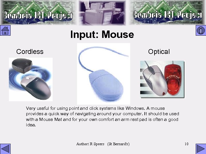 Input: Mouse Cordless Optical Very useful for using point and click systems like Windows. A mouse provides a quick way of navigating around your computer. It should be used with a Mouse Mat and for your own comfort an arm rest pad is often a good idea. Author: R Speers (St Bernard's) 10