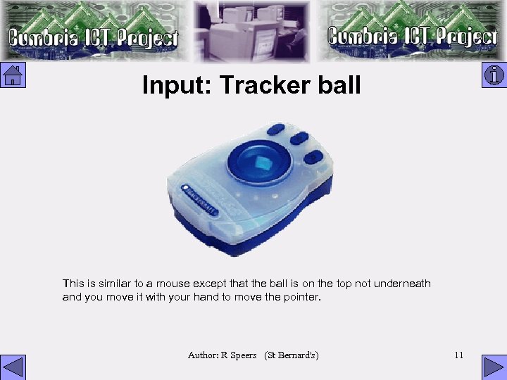 Input: Tracker ball This is similar to a mouse except that the ball is on the top not underneath and you move it with your hand to move the pointer. Author: R Speers (St Bernard's) 11