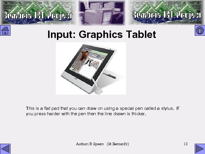 Input: Graphics Tablet This is a flat pad that you can draw on using a special pen called a stylus. If you press harder with the pen the line drawn is thicker. Author: R Speers (St Bernard's) 12