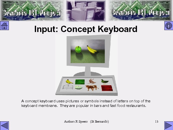 Input: Concept Keyboard A concept keyboard uses pictures or symbols instead of letters on top of the keyboard membrane. They are popular in bars and fast food restaurants. Author: R Speers (St Bernard's) 13