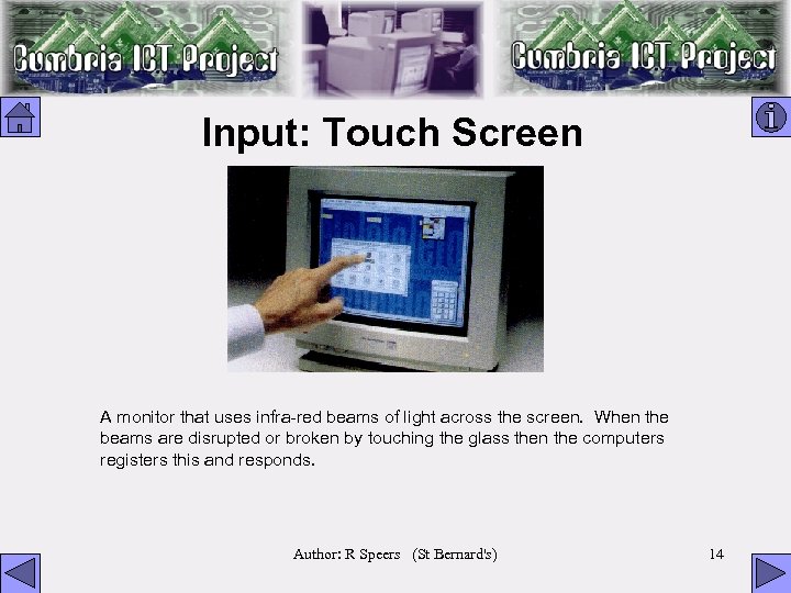 Input: Touch Screen A monitor that uses infra-red beams of light across the screen. When the beams are disrupted or broken by touching the glass then the computers registers this and responds. Author: R Speers (St Bernard's) 14