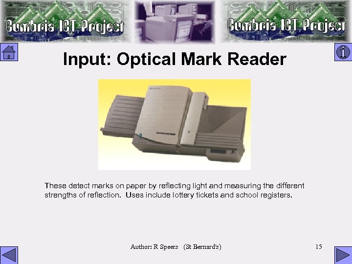 Input: Optical Mark Reader These detect marks on paper by reflecting light and measuring the different strengths of reflection. Uses include lottery tickets and school registers. Author: R Speers (St Bernard's) 15