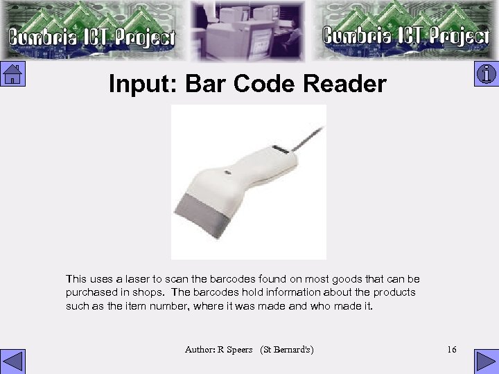 Input: Bar Code Reader This uses a laser to scan the barcodes found on most goods that can be purchased in shops. The barcodes hold information about the products such as the item number, where it was made and who made it. Author: R Speers (St Bernard's) 16