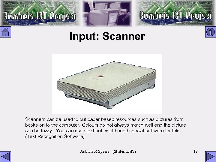 Input: Scanners can be used to put paper based resources such as pictures from books on to the computer. Colours do not always match well and the picture can be fuzzy. You can scan text but would need special software for this. (Text Recognition Software) Author: R Speers (St Bernard's) 18