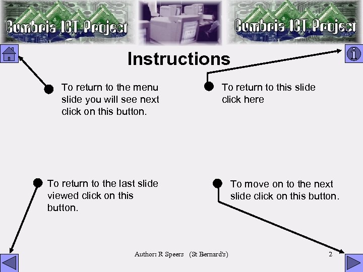 Instructions • To return to the menu slide you will see next click on this button. • To return to the last slide viewed click on this button. • To return to this slide click here • To move on to the next slide click on this button. Author: R Speers (St Bernard's) 2
