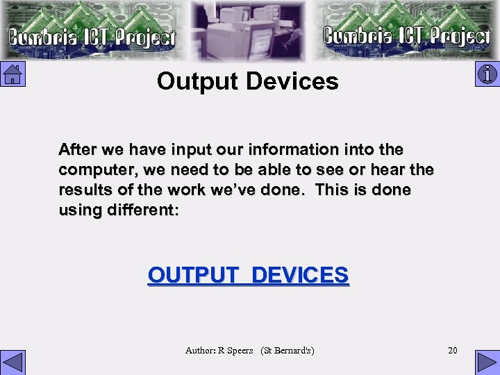Output Devices After we have input our information into the computer, we need to be able to see or hear the results of the work we’ve done. This is done using different: OUTPUT DEVICES Author: R Speers (St Bernard's) 20