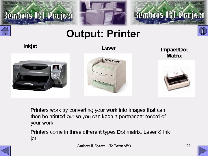 Output: Printer Inkjet Laser Impact/Dot Matrix Printers work by converting your work into images that can then be printed out so you can keep a permanent record of your work. Printers come in three different types Dot matrix, Laser & Ink jet. Author: R Speers (St Bernard's) 22