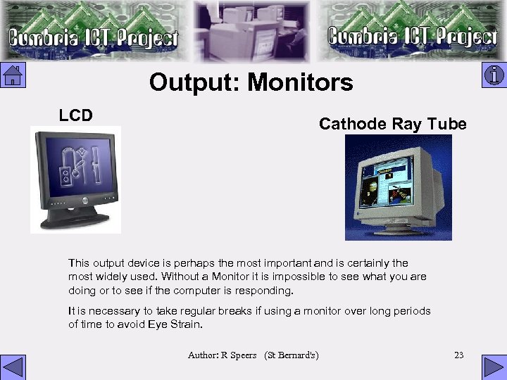 Output: Monitors LCD Cathode Ray Tube This output device is perhaps the most important and is certainly the most widely used. Without a Monitor it is impossible to see what you are doing or to see if the computer is responding. It is necessary to take regular breaks if using a monitor over long periods of time to avoid Eye Strain. Author: R Speers (St Bernard's) 23