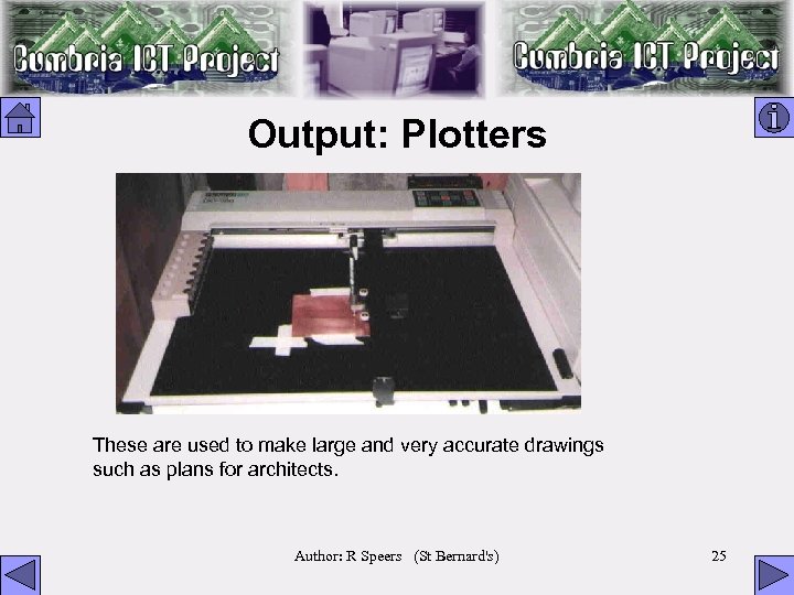 Output: Plotters These are used to make large and very accurate drawings such as plans for architects. Author: R Speers (St Bernard's) 25