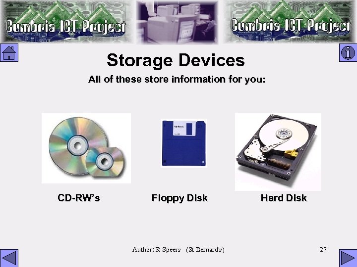 Storage Devices All of these store information for you: CD-RW’s Floppy Disk Author: R Speers (St Bernard's) Hard Disk 27
