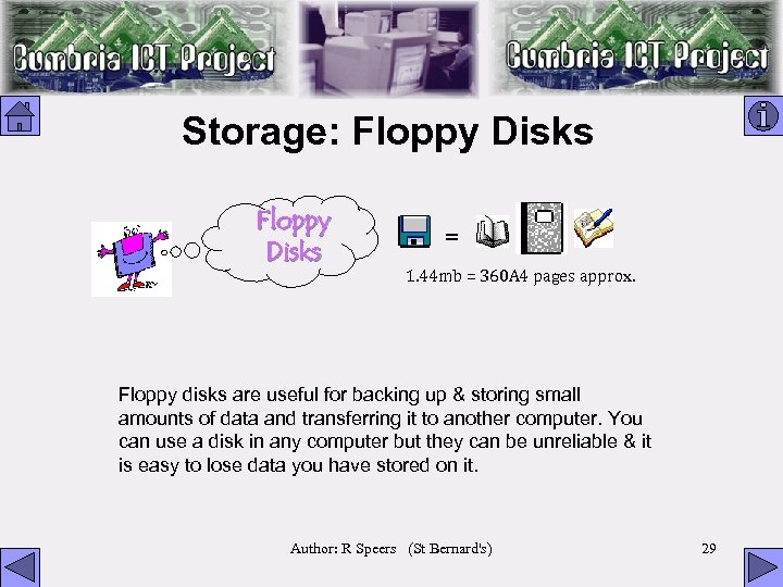 Storage: Floppy Disks = 1. 44 mb = 360 A 4 pages approx. Floppy disks are useful for backing up & storing small amounts of data and transferring it to another computer. You can use a disk in any computer but they can be unreliable & it is easy to lose data you have stored on it. Author: R Speers (St Bernard's) 29