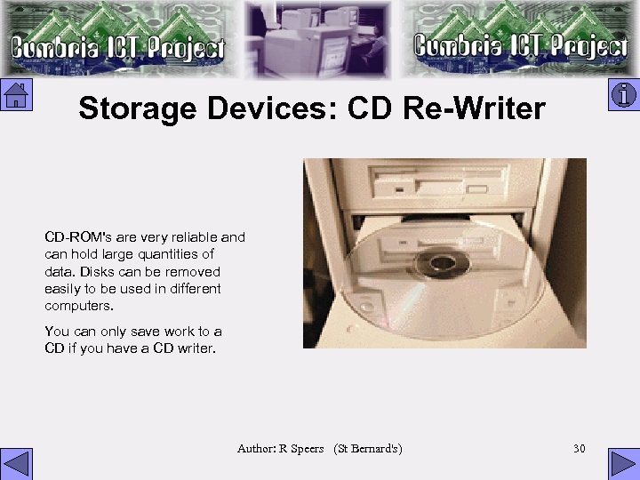 Storage Devices: CD Re-Writer CD-ROM's are very reliable and can hold large quantities of data. Disks can be removed easily to be used in different computers. You can only save work to a CD if you have a CD writer. Author: R Speers (St Bernard's) 30