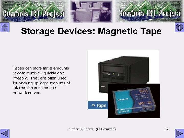 Storage Devices: Magnetic Tapes can store large amounts of data relatively quickly and cheaply. They are often used for backing up large amounts of information such as on a network server. Author: R Speers (St Bernard's) 34