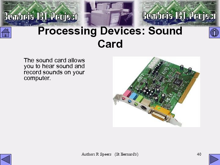 Processing Devices: Sound Card The sound card allows you to hear sound and record sounds on your computer. Author: R Speers (St Bernard's) 40