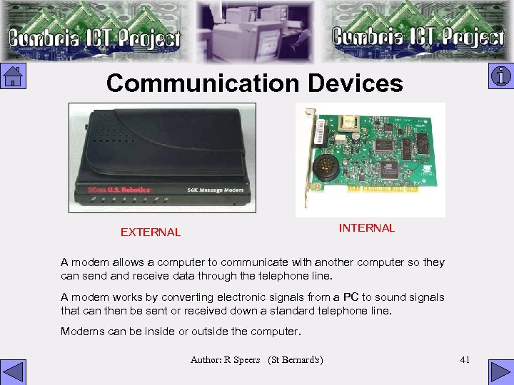 Communication Devices INTERNAL EXTERNAL A modem allows a computer to communicate with another computer so they can send and receive data through the telephone line. A modem works by converting electronic signals from a PC to sound signals that can then be sent or received down a standard telephone line. Modems can be inside or outside the computer. Author: R Speers (St Bernard's) 41