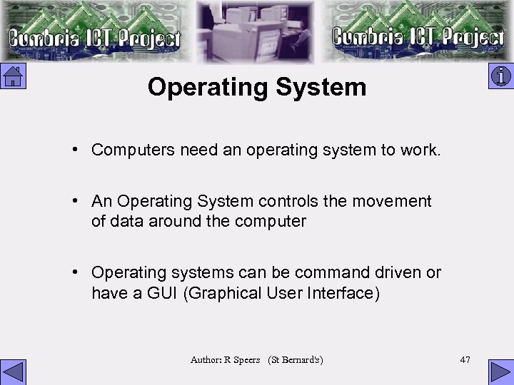 Operating System • Computers need an operating system to work. • An Operating System controls the movement of data around the computer • Operating systems can be command driven or have a GUI (Graphical User Interface) Author: R Speers (St Bernard's) 47