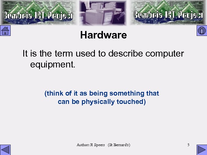 Hardware It is the term used to describe computer equipment. (think of it as being something that can be physically touched) Author: R Speers (St Bernard's) 5