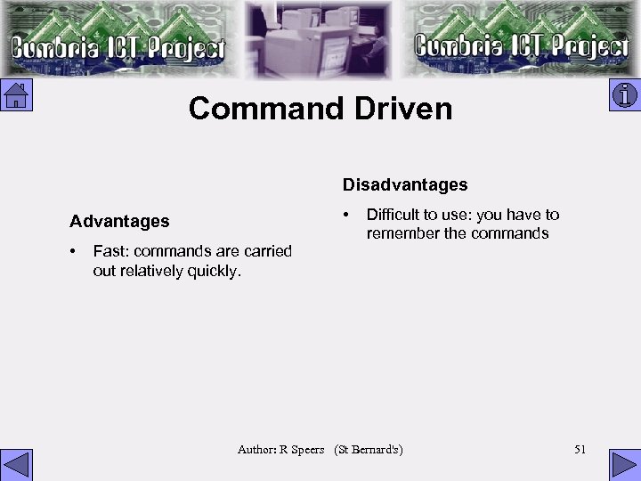 Command Driven Disadvantages • Advantages • Fast: commands are carried out relatively quickly. Difficult to use: you have to remember the commands Author: R Speers (St Bernard's) 51
