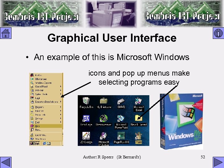 Graphical User Interface • An example of this is Microsoft Windows icons and pop up menus make selecting programs easy Author: R Speers (St Bernard's) 52