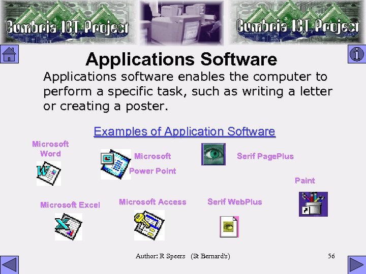Applications Software Applications software enables the computer to perform a specific task, such as writing a letter or creating a poster. Examples of Application Software Microsoft Word Microsoft Serif Page. Plus Power Point Paint Microsoft Excel Microsoft Access Serif Web. Plus Author: R Speers (St Bernard's) 56