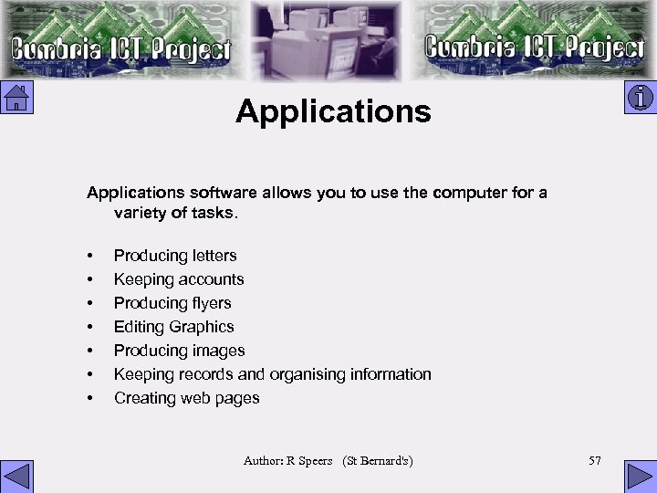 Applications software allows you to use the computer for a variety of tasks. • • Producing letters Keeping accounts Producing flyers Editing Graphics Producing images Keeping records and organising information Creating web pages Author: R Speers (St Bernard's) 57