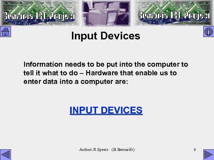 Input Devices Information needs to be put into the computer to tell it what to do – Hardware that enable us to enter data into a computer are: INPUT DEVICES Author: R Speers (St Bernard's) 6