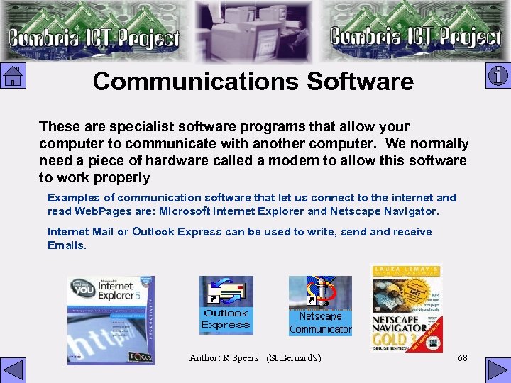 Communications Software These are specialist software programs that allow your computer to communicate with another computer. We normally need a piece of hardware called a modem to allow this software to work properly Examples of communication software that let us connect to the internet and read Web. Pages are: Microsoft Internet Explorer and Netscape Navigator. Internet Mail or Outlook Express can be used to write, send and receive Emails. Author: R Speers (St Bernard's) 68