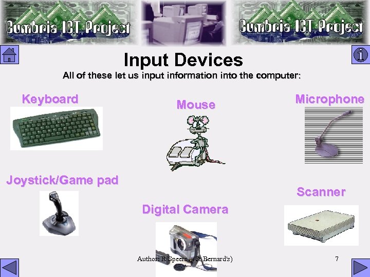 Input Devices All of these let us input information into the computer: Keyboard Mouse Joystick/Game pad Microphone Scanner Digital Camera Author: R Speers (St Bernard's) 7
