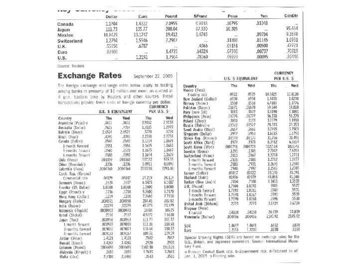 Spot Market for Foreign Exchange • Spot Market value date = 2 days (to clear) – WSJ gives Ask/Offer Rate ~ selling price – Any published rate is for a specific time – may change 15, 000 times a day or more. • Spreads – BID (buying) rate and ASK rate • e. g. , monitor might show “CAD 1. 5223 -28 (per US$). ” BID = 1. 5223, ASK = 1. 5228. Spread is 5 “pips, ” where pip is last decimal. – Spread is a transaction cost – Spread is larger for more thinly traded (lower liquidity) currencies • Rate Determination ~ supply of and demand for currencies. – Central Bank intervention influences supply and/or demand