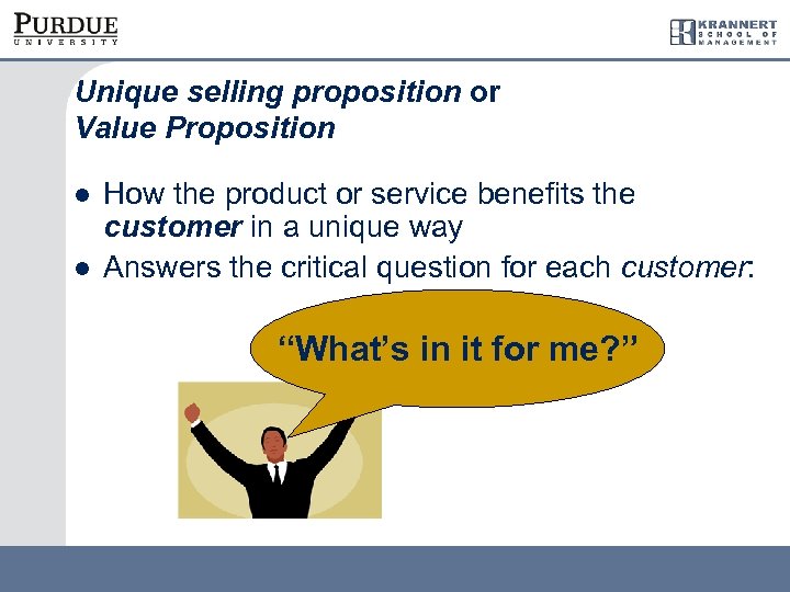 Unique selling proposition or Value Proposition l l How the product or service benefits the customer in a unique way Answers the critical question for each customer: “What’s in it for me? ”