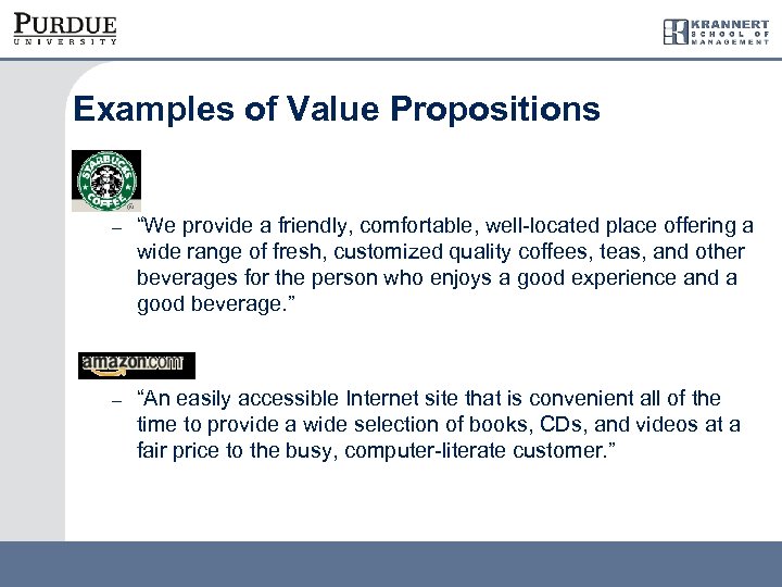 Examples of Value Propositions – “We provide a friendly, comfortable, well-located place offering a wide range of fresh, customized quality coffees, teas, and other beverages for the person who enjoys a good experience and a good beverage. ” – “An easily accessible Internet site that is convenient all of the time to provide a wide selection of books, CDs, and videos at a fair price to the busy, computer-literate customer. ”