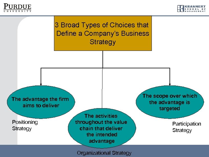 3 Broad Types of Choices that Define a Company’s Business Strategy The scope over which the advantage is targeted The advantage the firm aims to deliver Positioning Strategy The activities throughout the value chain that deliver the intended advantage Organizational Strategy Participation Strategy