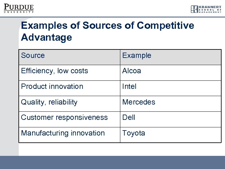 Examples of Sources of Competitive Advantage Source Example Efficiency, low costs Alcoa Product innovation Intel Quality, reliability Mercedes Customer responsiveness Dell Manufacturing innovation Toyota